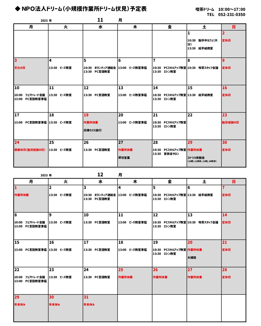 ❖予定表(PDF)のダウンロード ➡ NPO法人ドリーム予定表