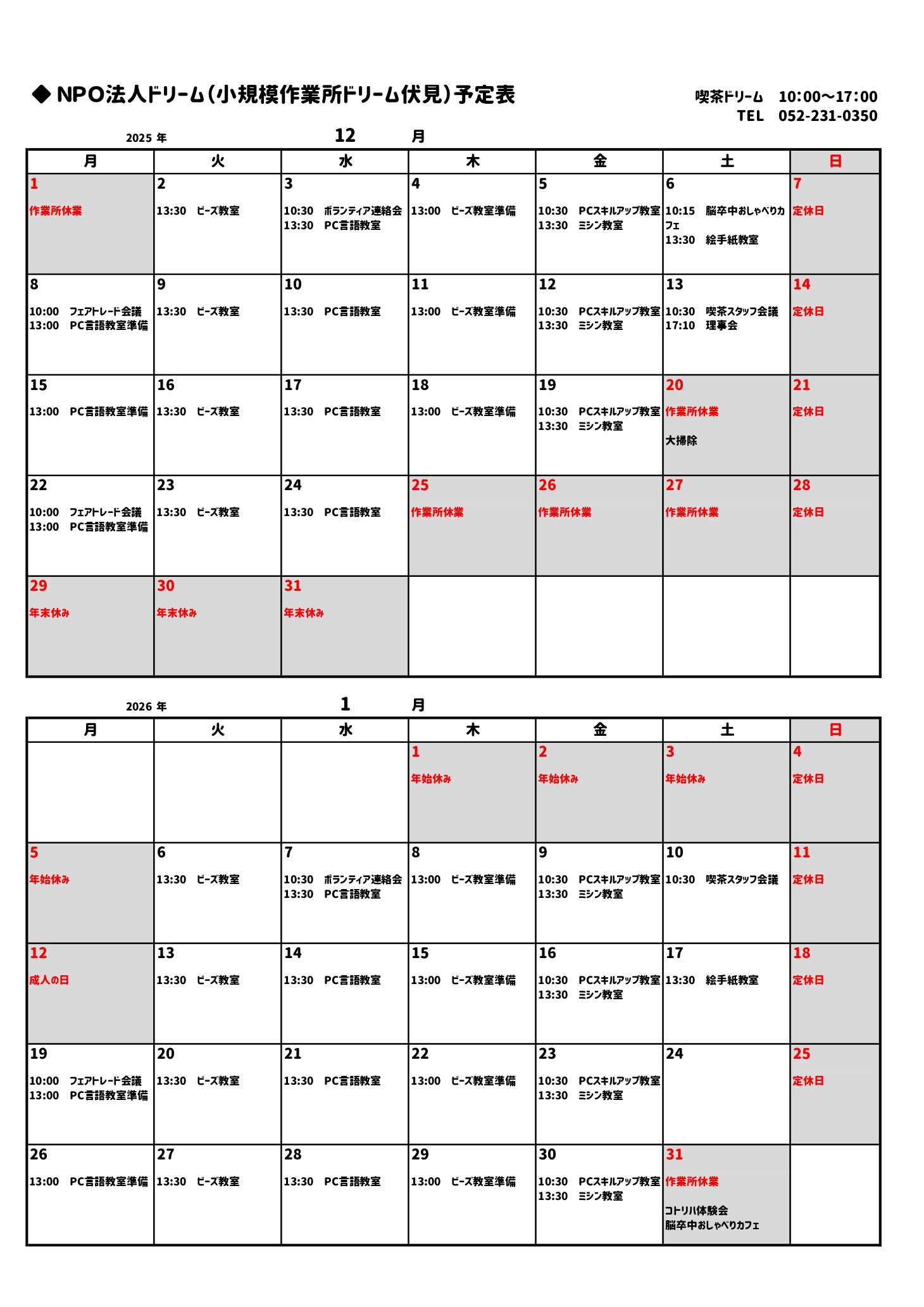 NPO法人ドリーム予定表(12月/1月)