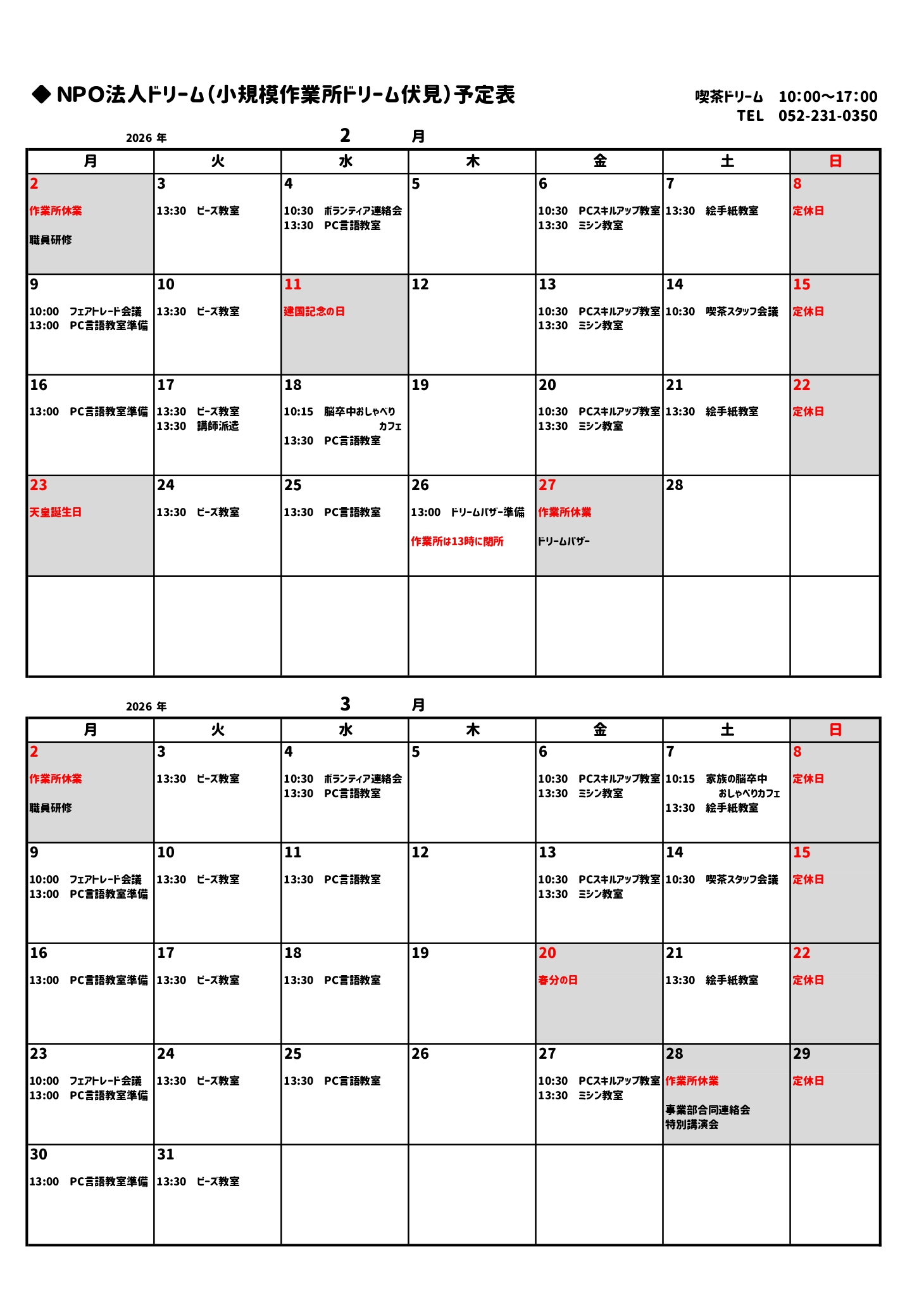 NPO法人ドリーム予定表(2月/3月)